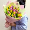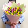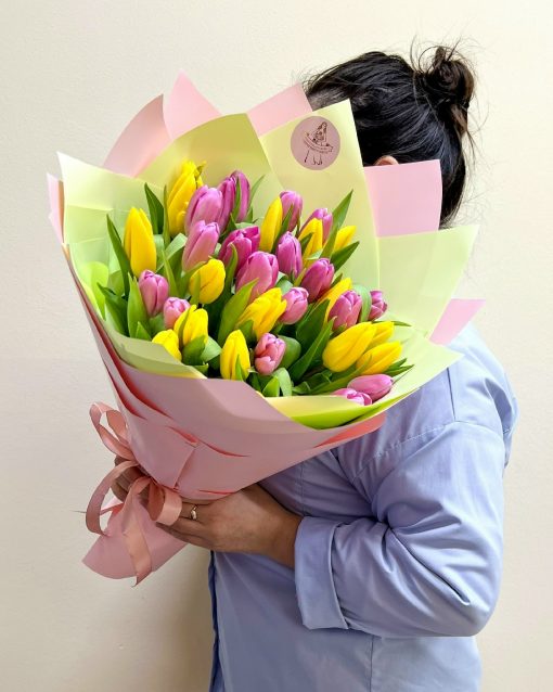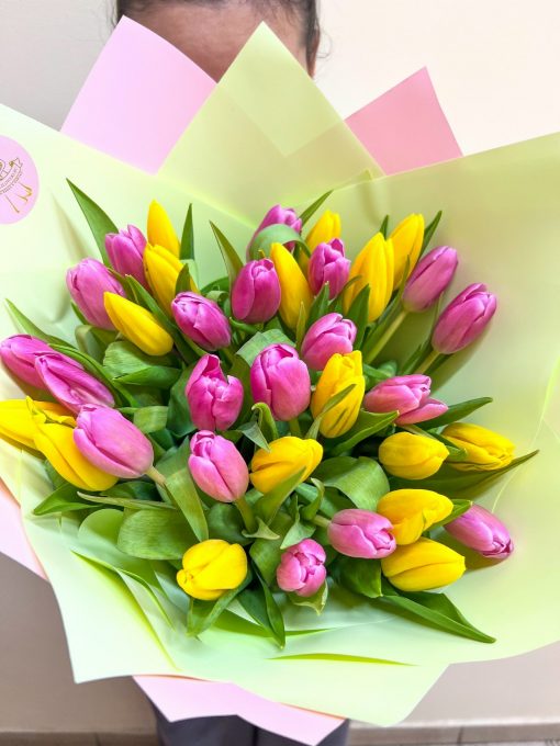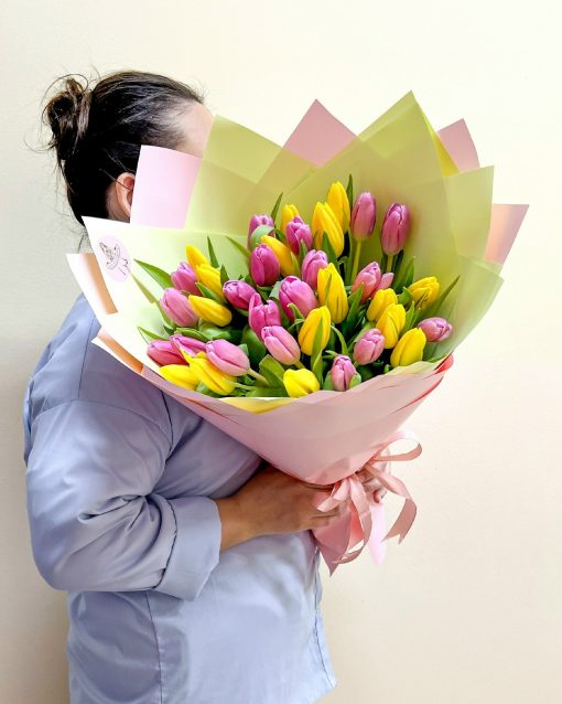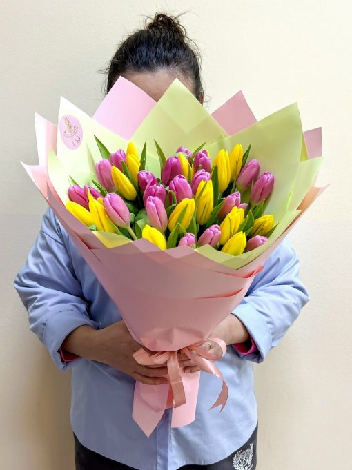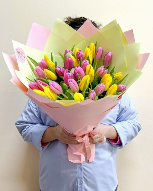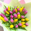 Букет из 35 жёлто-розовых тюльпанов