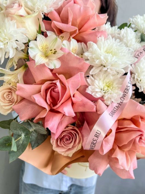 Композиция в шляпной коробке с французскойрозой и альстромерией Роза французская 3 шт Махровая хризантема 3 шт Роза Кения 40 см- 6 шт Альстромерия 3 шт Эвкалипт Пистация Лагурус 10 шт Коробка, оазис Ширина 32 см, высота 32 см В подарок: – Дизайнерская упаковка – Инструкция по уходу – Средство для продления жизни цветов 2 шт 🌷 Экспресс-доставка 🌷 Кешбэк от суммы заказа 🌷 Открытка в подарок 🌷 Фотоотчет перед отправкой