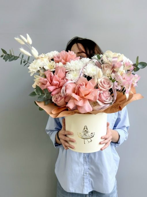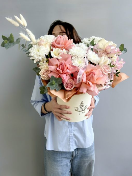 Композиция в шляпной коробке с французскойрозой и альстромерией