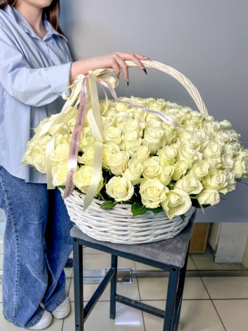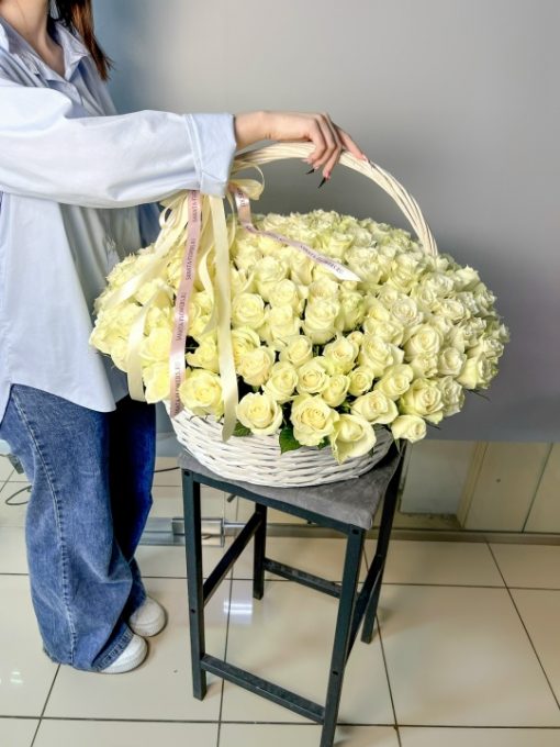 Корзина из 201 белой розы Кения 40 см В составе: Кенийская Роза 201 шт Корзина L, оазис 3 шт Ширина 65 см, высота 45 см В подарок: – Дизайнерская упаковка – Инструкция по уходу – Средство для продления жизни цветов 2 шт 🌷 Экспресс-доставка 🌷 Кешбэк от суммы заказа 🌷 Открытка в подарок 🌷 Фотоотчет перед отправкой