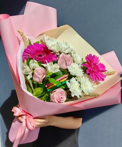 Нежный небольшой букет с кустовыми розами, хризантемами, гвоздиками, сухоцветами.