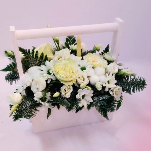 Состав композиции: деревянный ящик, оазис, нобилес 1 шт, хлопок 3 шт, белая роза 1 шт, хризантема 1 шт, эустома 1 шт, свеча тонкая 1 шт. ширина 33см высота 30см ящик средний