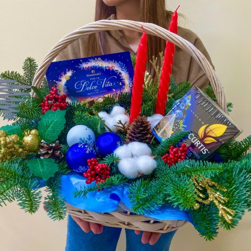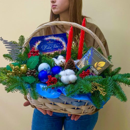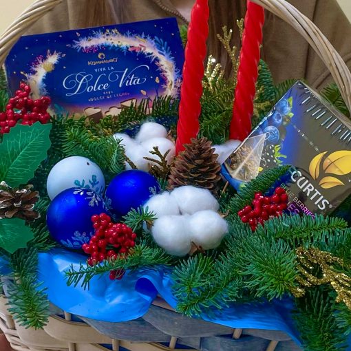 Большая корзина в синем цвете с разнообразным декором и сладостями: шишки, искусственные ягодки, ёлочные шары разных размеров, конфеты, чай, хлопок и свечи!🕯️ Корзина станет отличным подарком на Новый год для Ваших дорогих людей🎄🎁 Можем собрать в другом цвете и с декором на ваш вкус. 🤩