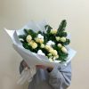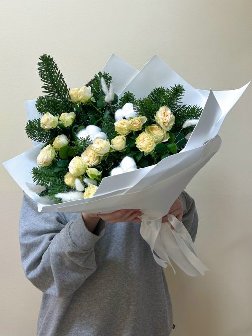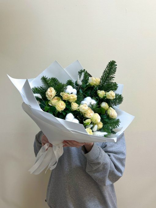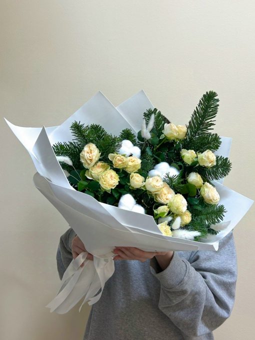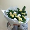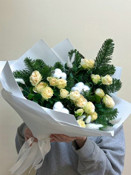 Букет из веточек живой ели и кустовых роз в авторской упаковке
