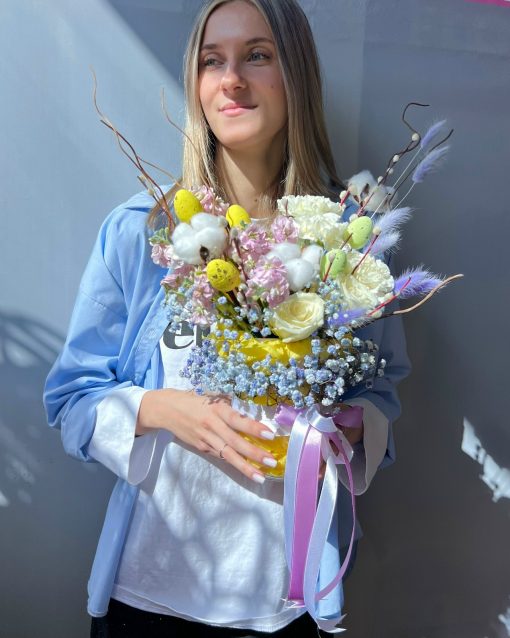 Прекрасная пасхальная композиция с гипсофилой в жёлтых и фиолетовых оттенках💜✨